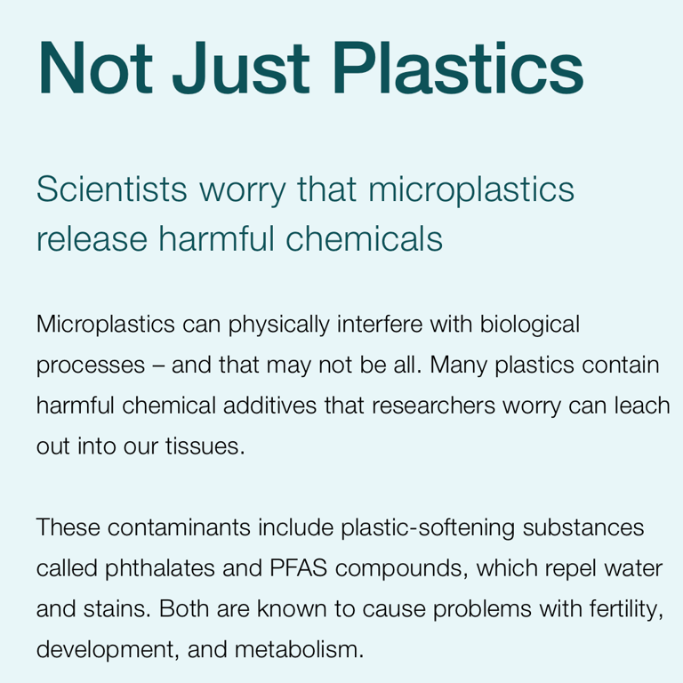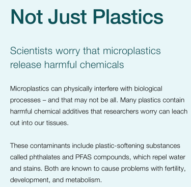 Scientific research and reviews point to several potential health impacts from microplastics and the chemicals they carry: